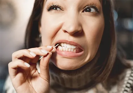 When something gets stuck between your teeth, it can become rather painful and could lead to infection. You'll need to get it our ASAP. First, try to get it out with some floss. If that hurts too much, you could also try something like Soft Picks for a gentler approach. If all else fails, you’re going to want to call the dentist.